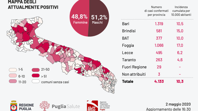 Il totale dei casi positivi Covid riscontrati in Puglia dall’inizio dell’emergenza è di 4.133 (su 65.370 test), così divisi: