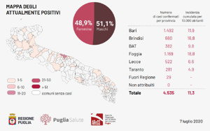 Il totale dei casi positivi Covid in Puglia è di 4.535, così suddivisi: