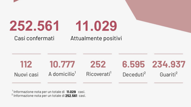 Dall’inizio dell’emergenza sono stati effettuati 2.590.229 test. 234.937 sono i pazienti guariti. 11.029 sono i casi attualmente positivi. Sono 252 le persone ricoverate in Ospedale. Ieri erano 269.