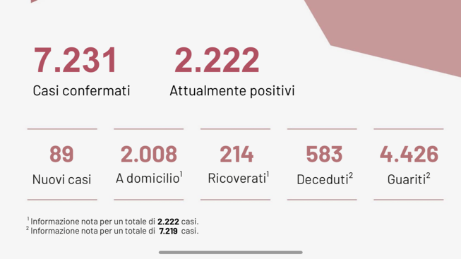 Dall’inizio dell’emergenza sono stati effettuati 385490 test. 4.426 sono i pazienti guariti. 2.222 sono i casi attualmente positivi.