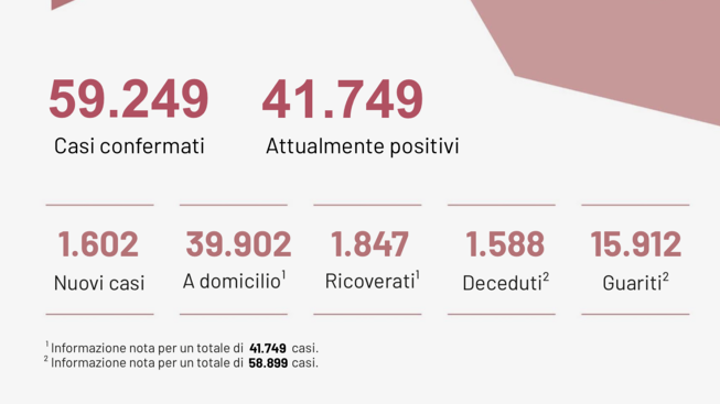 Il totale dei casi positivi Covid in Puglia è di 59.249, così suddivisi: