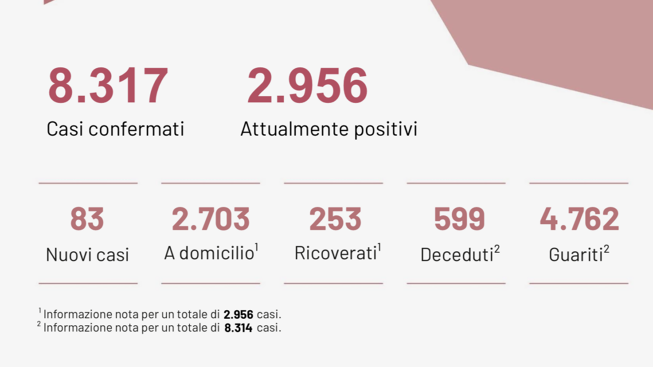 Dall’inizio dell’emergenza sono stati effettuati 426.286 test. Sono 4.762 i pazienti guariti. 2.956 sono i casi attualmente positivi.