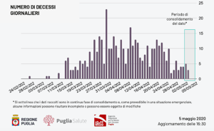 Sono stati registrati 4 decessi: 1 provincia di Brindisi, 2 in provincia di Foggia, 1 in provincia di Taranto (totali 434). I nuovi guariti sono stati 19, per un totale complessivo di 798 i pazienti guariti.