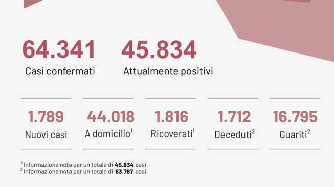 Il totale dei casi positivi Covid in Puglia è di 64.341, così suddivisi: