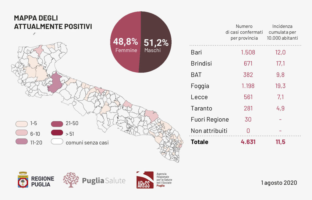 Il totale dei casi positivi Covid in Puglia è di 4631 così suddivisi: