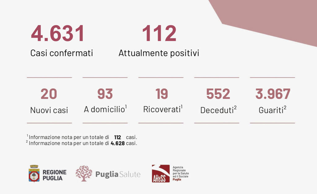 Nell’ultimo report, invece, la conta dei nuovi casi di Coronavirus sale a 20. Su 1832 test per l’infezione da Covid-19 effetuati, 20 sono risultati positivi: 4 in provincia Bari, 12 in provincia di Foggia e 4 in provincia di Lecce. Fermo, invece, il contatore dei decessi.