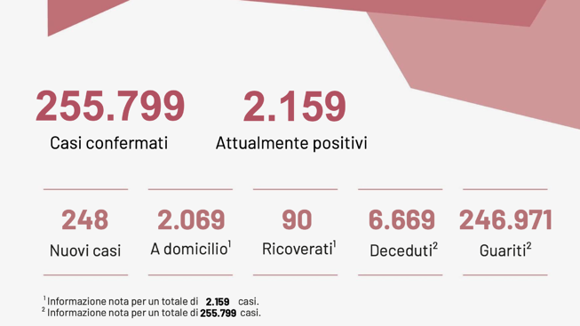 Dall’inizio dell’emergenza sono stati effettuati 2.885.860 test. 246.971 sono i pazienti guariti. 2159 sono i casi attualmente positivi.