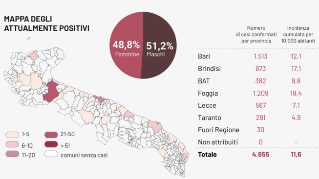 Il totale dei casi positivi Covid in Puglia è di 4655, così suddivisi: