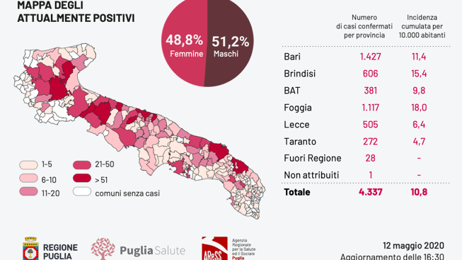 Il totale dei casi positivi riscontranti in Puglia è quindi di 4.337 (su 81.497 test), così divisi: