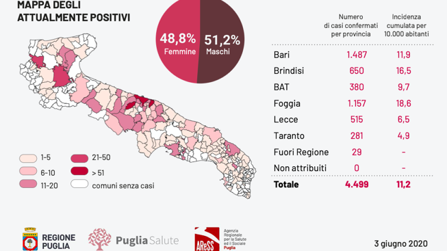 Il totale dei casi positivi Covid in Puglia è di 4.499 così divisi: