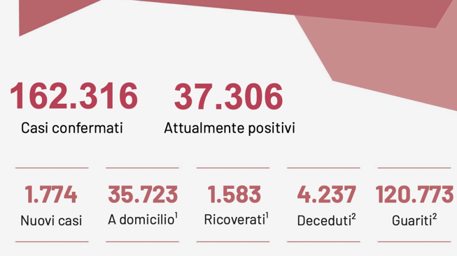 Dall’inizio dell’emergenza sono stati effettuati 1.672.408 test. 120.773 sono i pazienti guariti. 37.306 sono i casi attualmente positivi.