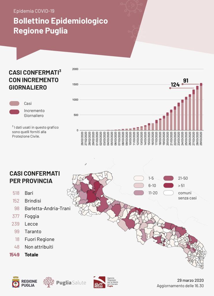 Dall’inizio dell’emergenza sono stati effettuati 12.631 test. 27 sono i pazienti guariti. Il totale dei casi positivi in Puglia è di 1.549 (ieri erano 1.458). Così divisi:
