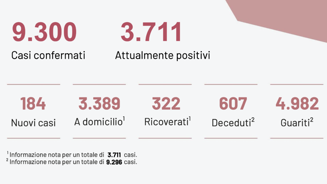 Con i casi odierni, gli attuali positivi presenti in Puglia salgono a 3.711. Di questi, i ricoverati sono 322, mentre i positivi seguiti a domicilio sono 3.389. Dall’inizio dell’emergenza sono stati effettuati 450.063 test ed il totale dei casi registrati dall’insorgenza della pandemia ad oggi è di 9.300. di questi 4.982 sono i guariti, mentre 607 sono i decessi.