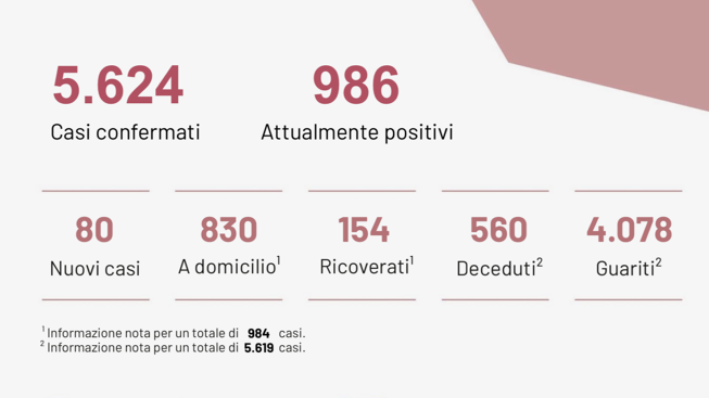 Dall’inizio dell’emergenza sono stati effettuati 316840 test. 4.078 sono i pazienti guariti. 986 sono i casi attualmente positivi.