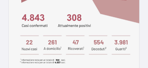 Ancora a zero, fortunatamente la casella dei decessi. Dall’inizio dell’emergenza, quindi, sono stati effettuati 266.293 test. 3.981 sono i pazienti guariti. 308 sono i casi attualmente positivi.