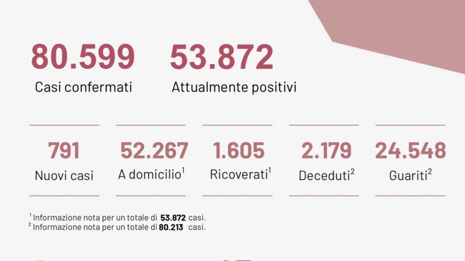 Dall’inizio dell’emergenza sono stati effettuati 959.266 test. 24.548 sono i pazienti guariti. 53.872 sono i casi attualmente positivi di cui 1.605 ricoverati in Ospedale, meno di ieri.