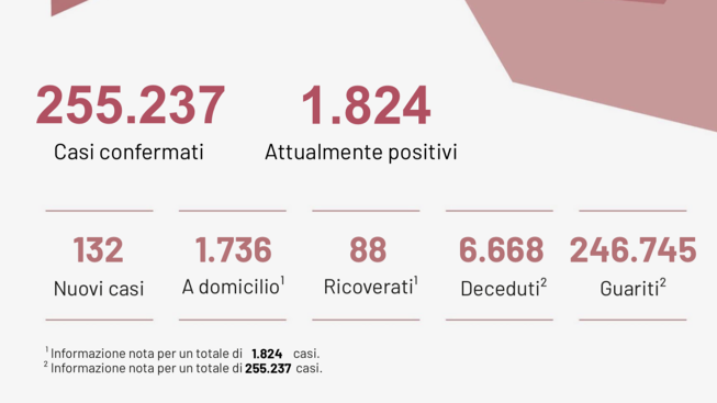 Dall’inizio dell’emergenza sono stati effettuati 2.850.144 test. 246.745 sono i pazienti guariti. 1.824 sono i casi attualmente positivi.