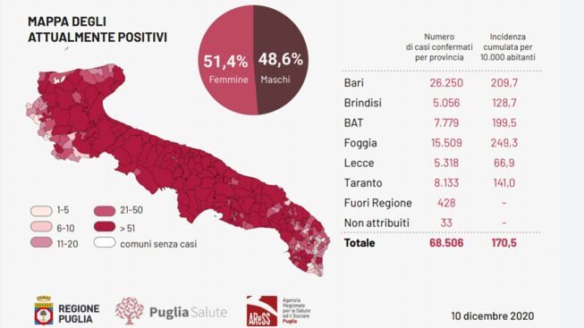 Il totale dei casi positivi Covid registrati in Puglia dall’inizio dell’emergenza pandemica sale quindi a quota 68.506, così suddivisi: