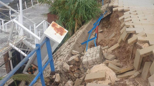 In particolare, Andrano è stata duramente colpita. Nella mattinata di oggi, poco prima delle 10:00, sul lungomare delle Agavi, sono crollati di un muro di cinta, il basolato appena rifatto di fronte al Pisco River’s Bar e un traliccio.
