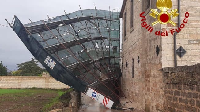 La struttura, di circa 12×12 metri, realizzata con tubi innocenti e pedane e rivestita con telo ombreggiante, era fissata alla facciata di un vecchio casolare in fase di ristrutturazione. Il crollo ha interessato un lato dell’impalcatura, che è rimasta in bilico, appoggiandosi su alcuni cavi Enel.