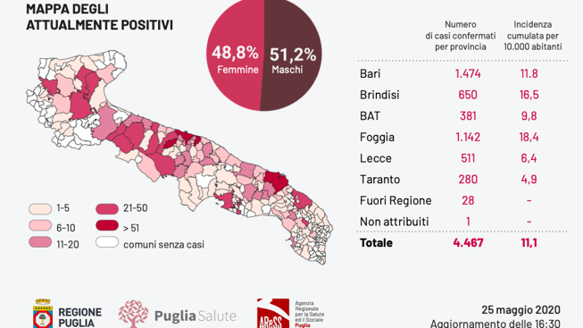Il dato complessivo di casi riscontrati in Puglia di Coronavirus, dunque, è di 4.467 (su 104.670 tamponi), così suddivisi: