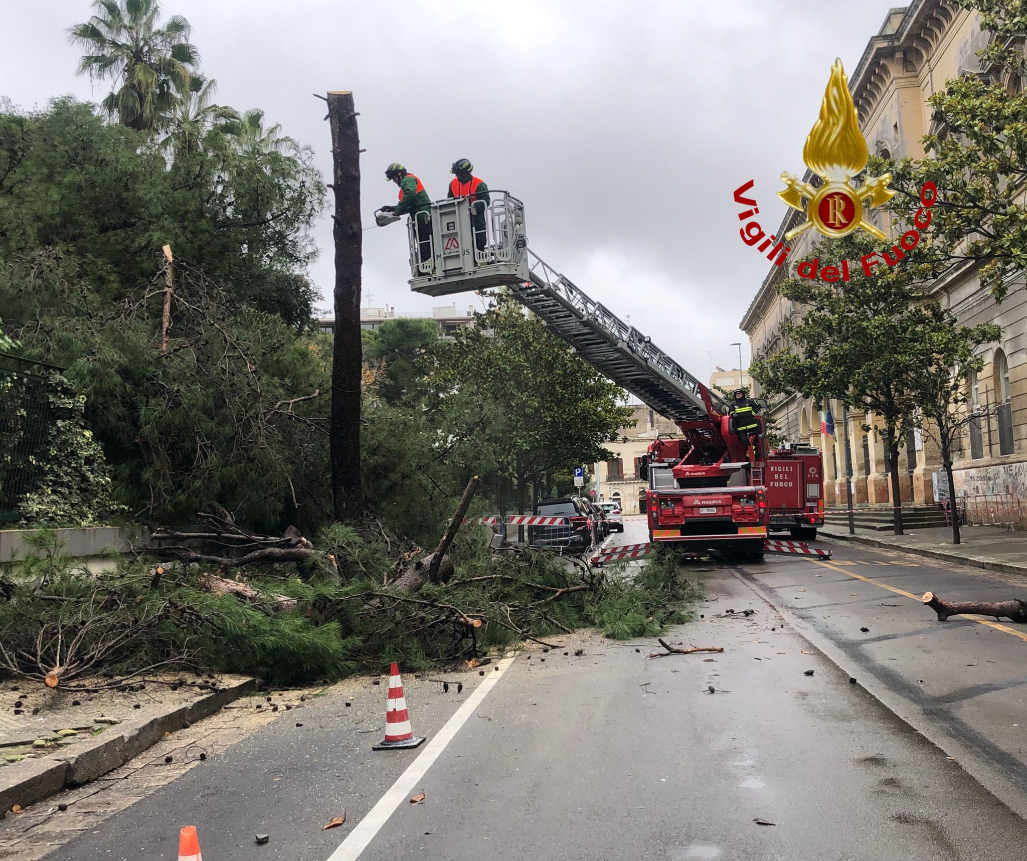 Anche a Lecce si è reso necessario l’intervento dei Vigili del Fuoco: come si vede dalle immagini, un albero pericolante è stato rimosso da parte degli uomini in divisa in via Costa.