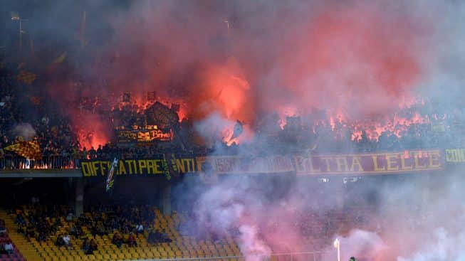 Il supporter, infatti, la sera della gara, intorno alle ore 20.50 circa, presso l’ingresso numero 11 dello stadio leccese, mentre si trovava nell’area di filtraggio, è stato controllato dagli agenti presenti sul posto e trovato in possesso di un fumogeno inesploso della lunghezza di circa 10 centimetri, occultato nei pantaloni all’altezza della cintola che è stato posto sotto sequestro.