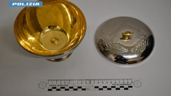 Alla luce delle informazioni, gli agenti si sono recati presso l’abitazione dell’uomo, un 40enne che dopo i primi tentennamenti in merito alla sua presenza il giorno del furto all’interno dell’edificio di culto, ha poi confessato di essersi impossessato di un oggetto sacro e di averlo in casa . Gli agenti all’interno della stanza hanno rinvenuto la Pisside vuota, ma non gli altri due oggetti scomparsi dal Tabernacolo e che l’uomo negava di aver rubato.
