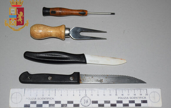Dalla successiva perquisizione personale, nelle tasche dei pantaloni, sono stati rinvenuti: un cacciavite; un utensile da cucina a due punte; un coltello da cucina con lama in ceramica; un coltello da cucina seghettato.