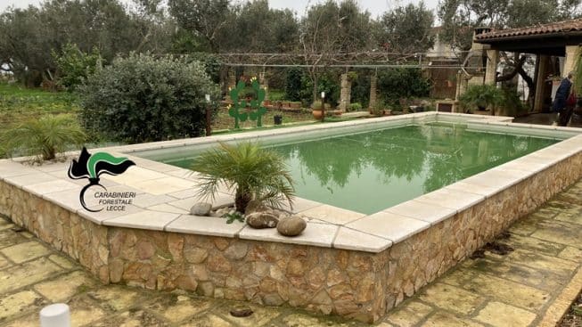 L’ultimo episodio riguarda un accertamento compiuto dai Militari del Nucleo Forestale di Tricase, da cui è scaturito che una piscina realizzata, della superficie di 45 metri quadri, parzialmente funzionante, di pertinenza di una costruzione residenziale in agro di Tiggiano, in località “Le Chiuse”, priva di titolo edilizio e permesso di costruire, assenti anche le necessarie autorizzazioni per le zone sottoposte a vincoli.