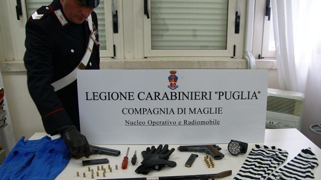 Le successive perquisizioni domiciliari effettuate a Casarano hanno permesso inoltre di rinvenire e sottoporre a sequestro a casa di uno degli autori una pistola tipo marca “bruni automatic” calibro 8 mm priva di matricola. E, raccontano gli operatori, modificata ma non funzionante poiché danneggiata. Presenti anche 11 cartucce cal. 7,65. a casa di un altro protagonista della vicenda, invece, una pistola dello stesso tipo, modificata con canna calibro 7,65, funzionante, con il caricatore inserito contenente 3 cartucce ed una busta in cellophane contenente ulteriori 11 cartucce del medesimo calibro.