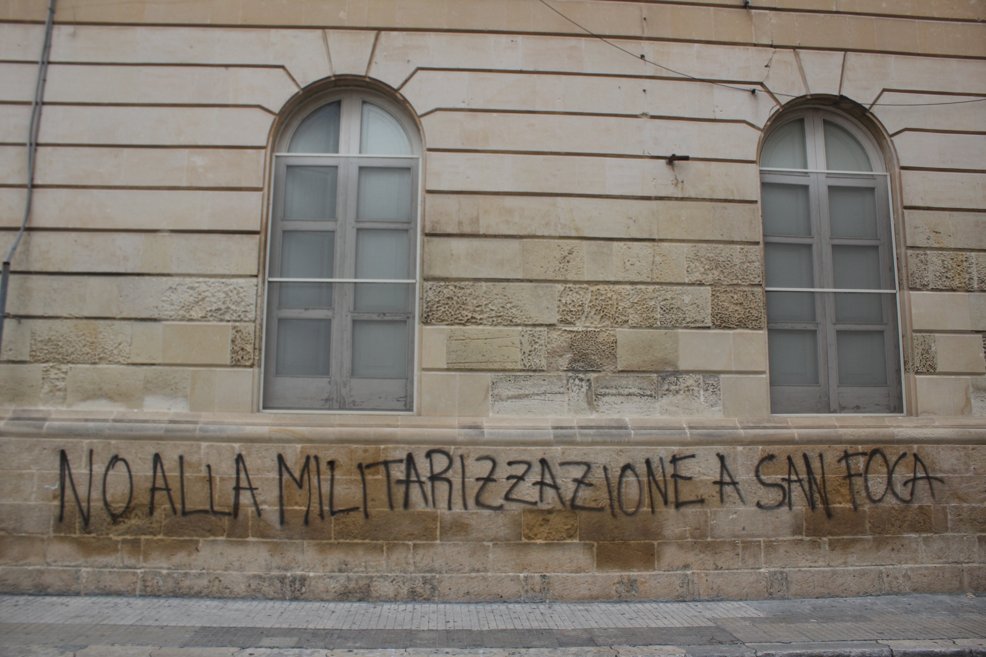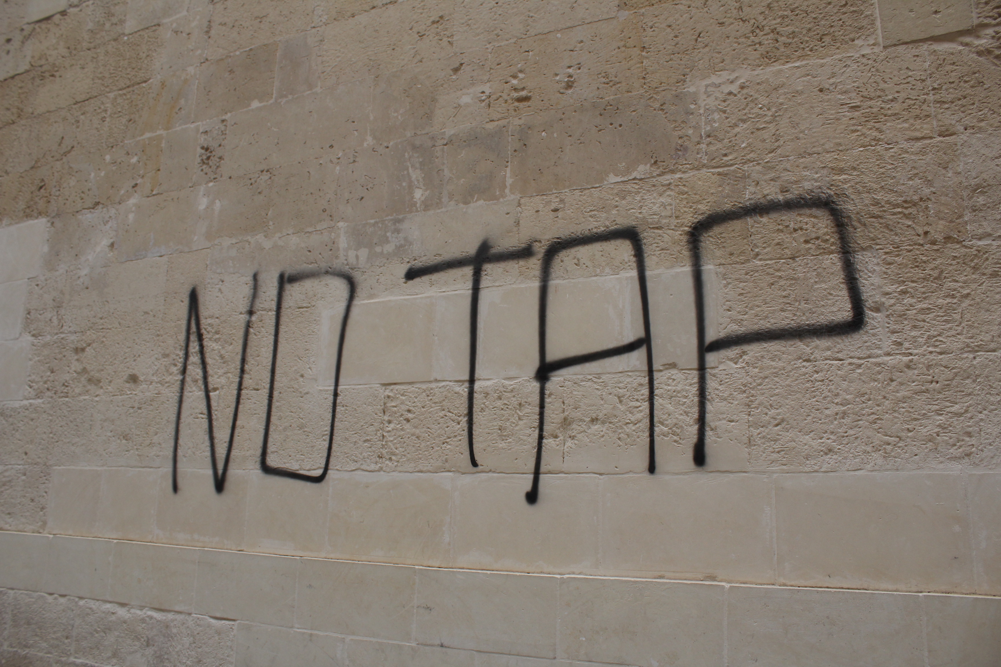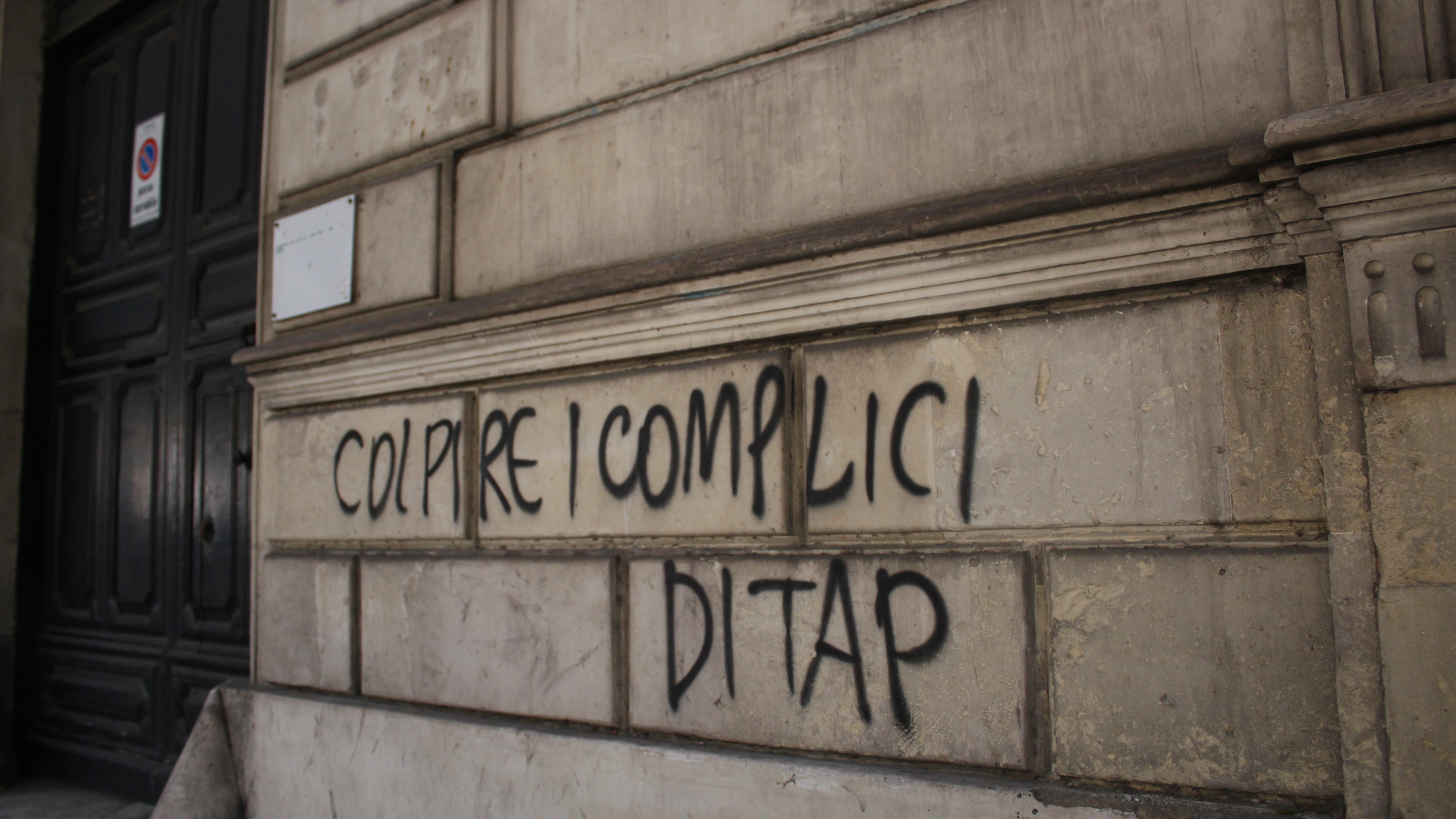 Durante il passaggio dei manifestanti nei viali cittadini, i dimostranti, approfittando della presenza di passanti e confondendosi con gli stessi, hanno imbrattato arredi urbani e muri, anche di edifici storici come l’Ufficio Centrale delle Poste Italiane e il Teatro Apollo con scritte in vernice rossa e spray nero “NO TAP” e frasi minacciose e offensive contro le Forze di Polizia, l’Eni e tutti i partners di TAP e contro l’Agenzia Interinale Adecco.
