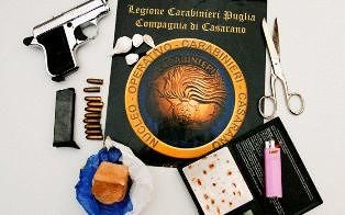 Nel pomeriggio di oggi i  Militari del Nucleo Operativo e Radiomobile- Aliquota Operativa di Casarano, al termine di una attività info-investigativa, a Racale hanno effettuato una perquisizione domiciliare presso l’abitazione del 35enne. L’uomo, su richiesta dei militari, ha indicato il luogo dove custodiva una pistola cal.8 di marca russa “non catalogata”  con “canna modificata”  – probabilmente all’origine pistola a salve – illegalmente detenuta, completa di caricatore e 10 proiettili cal.6.35 di cui uno inserito in canna. Il tutto era custodito sopra l’armadio della stanza della camera da letto. All’interno dell’armadio un involucro in cellophane contenente due dosi di cocaina pari a 1,8 gr.