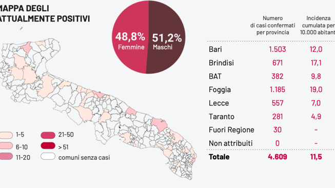 Il totale dei casi positivi Covid in Puglia, riscontrati dal’’inizio dell’emergenza, è di 4.609, così suddivisi: