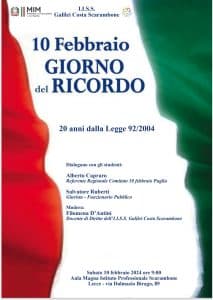Sabato 10 febbraio 2024, in via Dalmazio Birago 89, alle ore 9.00, presso la sede centrale dell’Istituto Galilei – Costa – Scarambone, guidato dalla dirigente scolastica Gabriella Margiotta, si terrà un incontro-dibattito tra gli studenti e Alberto Capraro, referente regionale per la Puglia del Comitato ’10 febbraio’ e Salvatore Ruberti, Giurista e Funzionario Pubblico.