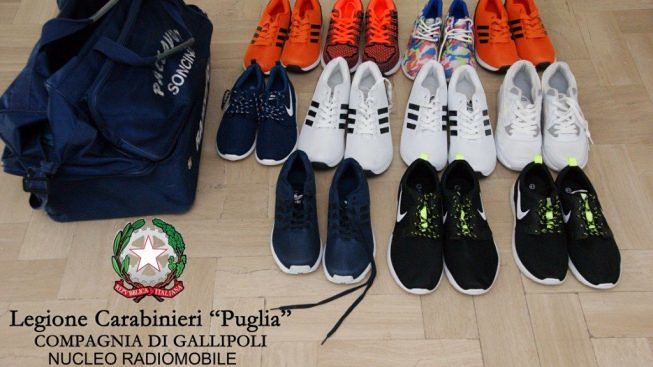 Inevitabile sono scattati il fermo e la perquisizione. Gli uomini dell’Arma hanno trovato nel borsone 11 paia di scarpe di noti marchi visibilmente contraffatti.