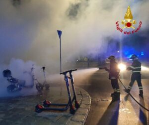 La squadra dei Caschi Rossi, giunta sul posto, ha provveduto a spegnere le fiamme che stavano consumando uno scooter elettrico a noleggio e un monopattino, sempre di quelli elettrici messi a disposizione in citta tramite noleggio. Terminate le operazioni di spegnimento e messo in sicurezza la zona interessata dall’evento, i Vigili del Fuoco del Comando provinciale di Lecce hanno dato avvio alle indagini per risalire alla cause.