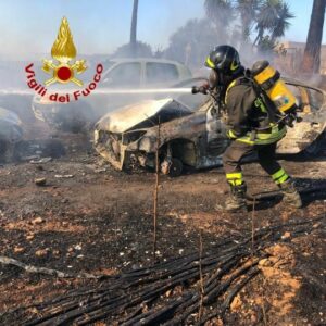 Il fuoco, alimentato dal forte vento, ha raggiunto i mezzi attraverso alcune sterpaglie. L’incendio ha interessato anche una vasta area di macchia mediterranea.