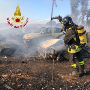 Fiamme nel pomeriggio di oggi a Nardò, dove, intorno alle 16.30, una squadra dei Vigili del Fuoco del Distaccamento di Veglie, insieme a un supporto del Comando Provinciale di Lecce, è stata chiamata a intervenire in Contrada Chiodi a seguito di un incendio che aveva coinvolto tre autovetture.