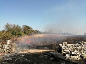 Insieme alle fiamme è stata segnalata la presenza di cumuli di eternit sul ciglio della strada, materiale notoriamente cancerogeno che si dovrebbe smaltire in maniera responsabile e che è immediatamente emerso alla vista non appena il fuoco ha bruciato l’erba presente.