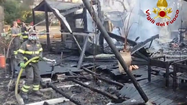 All’arrivo delle squadre sul posto, l’incendio è risultato già generalizzato e ha coinvolto in particolare una struttura in legno utilizzata come deposito alcolici, lavanderia stoviglie, bagno disabili e servizi igienici del personale.