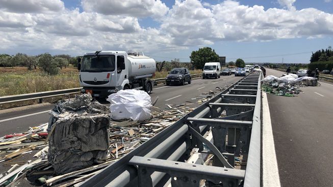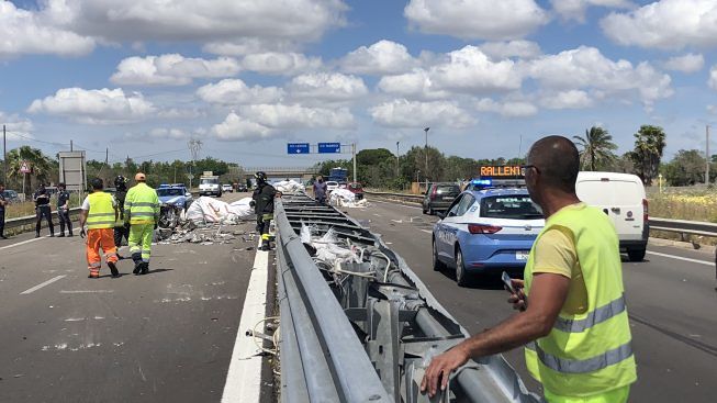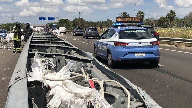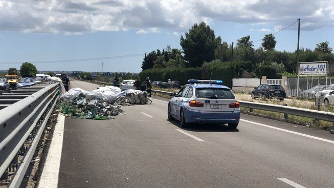 Sul posto anche i Vigili del Fuoco, i Carabinieri della compagnia di Gallipoli e gli agenti della Polizia stradale cui toccherà il compito di ricostruire l’accaduto. Secondo alcuni testimoni, l’autista del mezzo pesante, ad un certo punto, ha iniziato a sbandare pericolosamente. Il tir fuori controllo aveva agganciato due cassoni, uno dietro l’altro. L’ultimo si è ribaltato, all’altezza dello svincolo, non prima di aver riversato sul manto stradale il suo pesante carico. I ‘detriti’ erano ovunque.