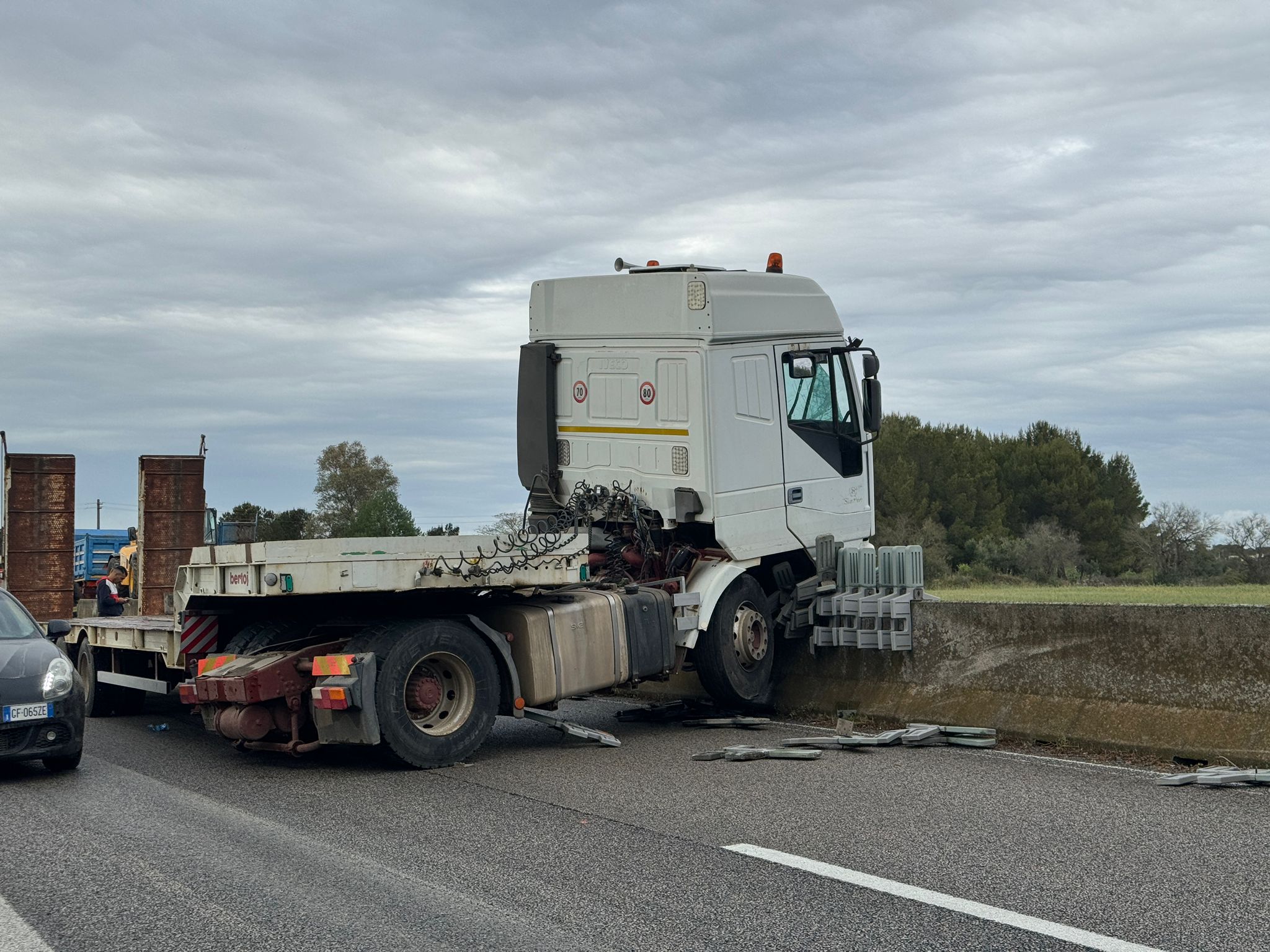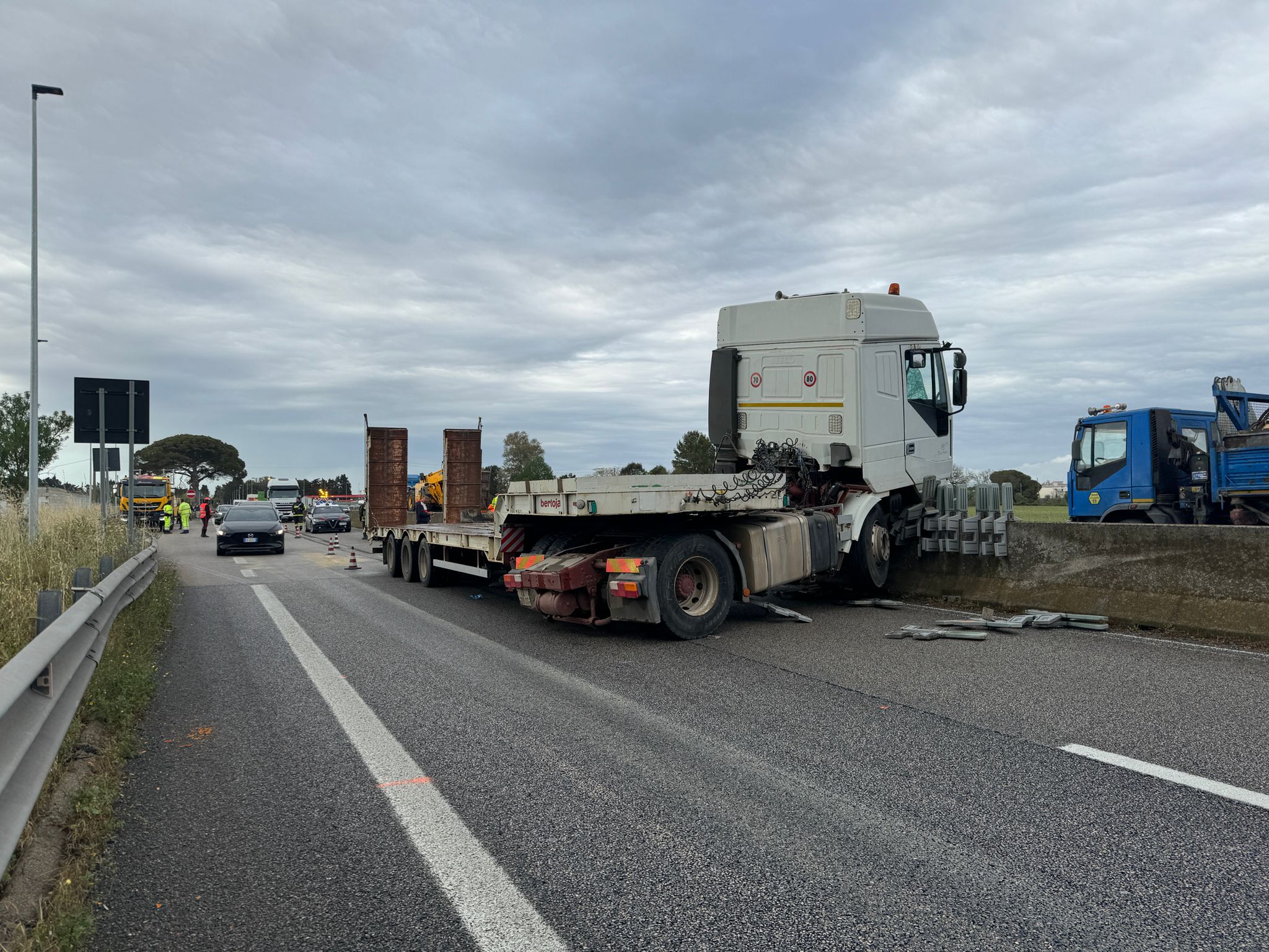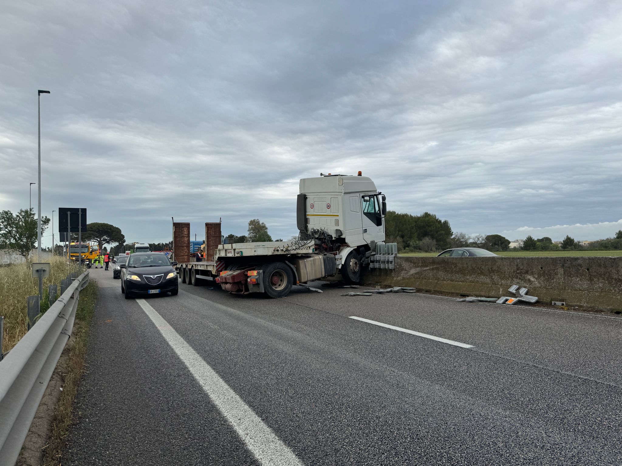 Fortunatamente non si contano feriti, ma chi ha assistito all’incidente stradale avvenuto sulla statale 16, non lontano dallo svincolo per Cavallino, ha temuto conseguenze più gravi. Secondo una prima ricostruzione dell’accaduto, un tir avrebbe sfondato il guar-rail in cemento che delimita la Maglie-Lecce, nel tratto su cui si affaccia il centro commerciale. Questa è la dinamica, ma restano da chiarire le cause. Toccherà agli uomini in divisa, giunti sul posto per i rilievi di rito, capire se l’autista abbia perso il controllo del mezzo pesante per un malore oppure per l’asfalto bagnato. Il conducente non ha riportato ferite, ma è stato accompagnato al Pronto Soccorso per gli accertamenti del caso.