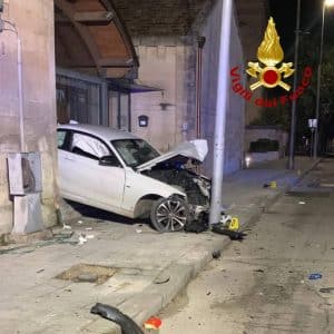 Giunti sul posto i Caschi Rossi hanno trovato una Bmw 320 incastrata tra il palo della luce e l’ingresso delle Officine Cantelmo.