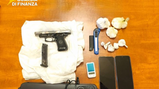 Le indagini si sono rapidamente spostate presso l’abitazione temporanea del sospettato e sul suo motoveicolo. Le perquisizioni approfondite hanno permesso di rinvenire circa 150 grammi di cocaina complessivi, materiale vario per il taglio e il confezionamento delle dosi e una pistola con matricola abrasa, priva di munizionamento.