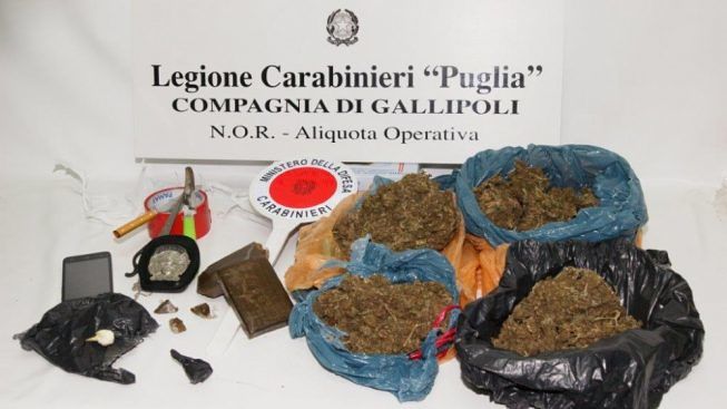 I Carabinieri hanno anche perquisito del locale da cui sarebbe stato visto uscire Barba. Effettivamente sono spuntati fuori, nascosti una busta della nettezza urbana: 1 chilo 200 grammi di marijuana, 2 etti di hashish; 6 grammi di cocaina, due coltelli ed un paio di forbici utilizzati per dividere la sostanza stupefacente.