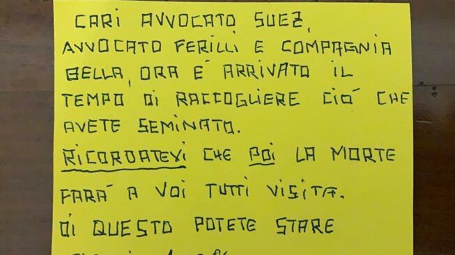 Il primo campanello d’allarme è partito quindici giorni fa, quando nella cassetta delle poste dello studio legale dell’avvocato Suez è stata lasciata una lettera dal contenuto intimidatorio, indirizzata anche all’avvocato Ferilli.