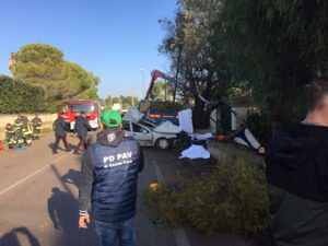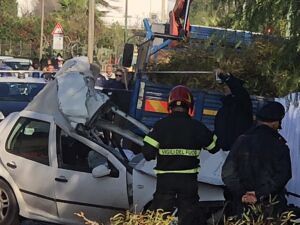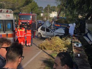 Una Golf Volkswagen bianca, fuori controllo, è finita contro un camion, fermo sul ciglio della strada. Destino ha voluto che accanto al mezzo ci fossero gli operai della Eco.Man Salento. L’impatto è stato terribile e, in pochi secondi, via Giorgio Almirante si è trasformata in un teatro di sangue.