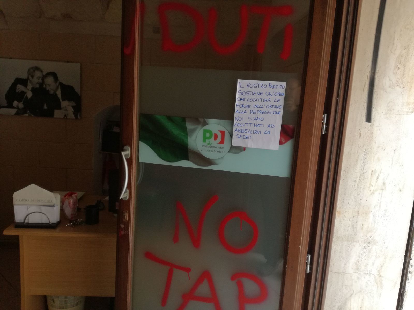 Non solo la sede del coordinamento provinciale di via Tasso a Lecce, ma anche i circoli comunali. I No Tap hanno ormai preso di mira il Partito Democratico e nella notte si sono presentati presso la sede cittadina di Martano, tempestando di scritte e volantini l’ingresso del locale.