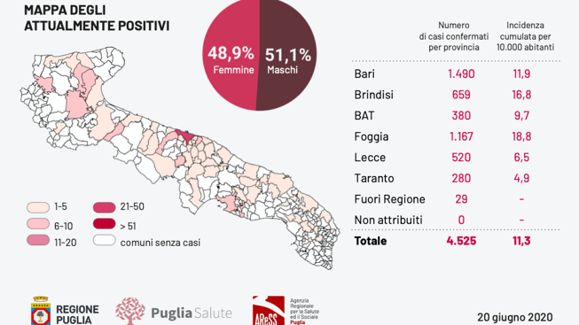 Il totale dei casi positivi da Covid in Puglia, registrati dall’inizio dell’emergenza epidemiologica, è di 4.525 (su 160.662 test) così suddivisi a livello territoriale: